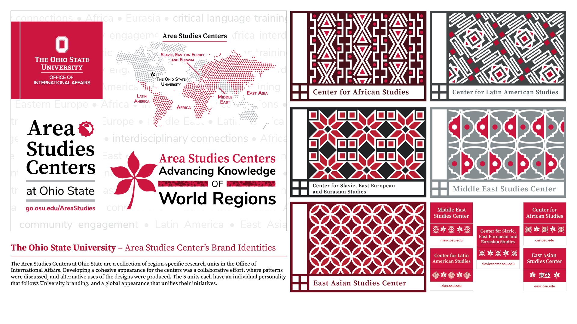 Area Studies Centers Branding - Micro brand identities for regional centers in the Office of International Affairs. Extra graphics are in the Portfolio PDF download on the 'About Me' page.