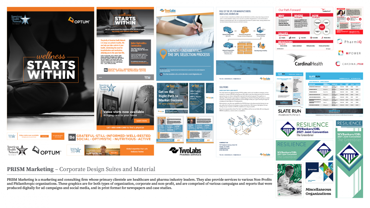 PRISM Marketing - Graphic suites for various healthcare, pharma corporations and non-profits, including Newspaper ads and Google Display Network ads. Extra graphics are in the Portfolio PDF download on the 'About Me' page.